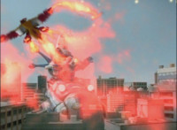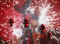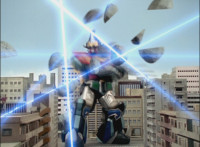 Ursus summons up a bunch of drones that zip around, and fly forth, Jenji hiding behind Solaris Knight, as the drones strafe the Solar Streak Megazord, spark bursting it. |