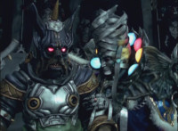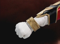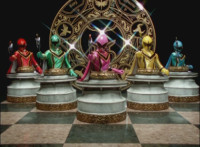Red leads the team in gesturing their hands to their chesspiece rims, causing them to glow. Manticore Megazord readies its staff, causing the blade to spin around, igniting the Megazord's flame wings. Ursus turns back around and raises arms. |