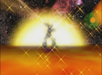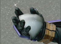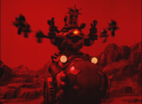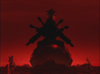 Between Imperious and Fightoe, is the giant robot known as Ursus. Imperious talks a bit, then spins around and whips his fan upward, causing a purple energy whirlwind to strike Fightoe, converting him into a glowing streak that flies up and into Ursus. Zoom in as Imperious talks. |