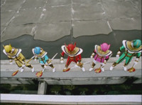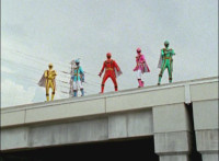 Zoom out as the five Rangers stand on the edge of a rooftop. |