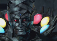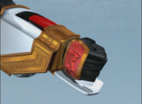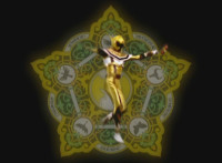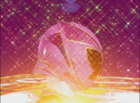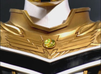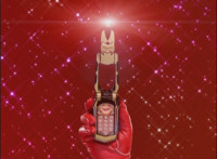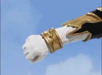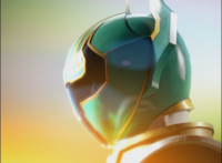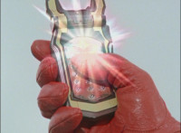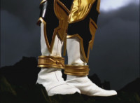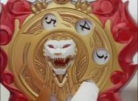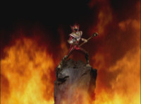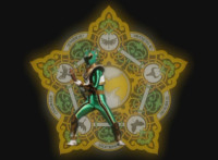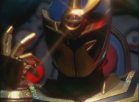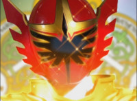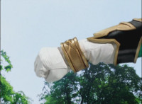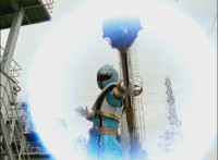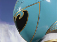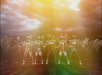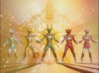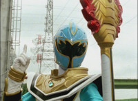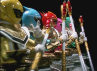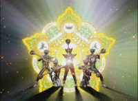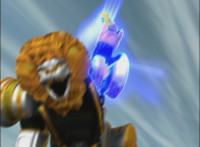 Red turns the 2 dial on his Mystic Lion Staff, and leads the team in lifting their Staffs up, causing a spectrum light to shine down upon them. 50 Below reacts, as the five Legend Mode Rangers combine their powers into a single concentrated golden beam, firing it into 50 Below, and sending him flying up into the ice boulder. The Rangers turn around and pose, 50 Below's mask cracks, then the entire ice boulder explodes in the sky, taking him with it. |