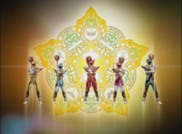 The five Rangers pose as they morph into Legend Mode, before one grabs a Mystic Lion Staff. |