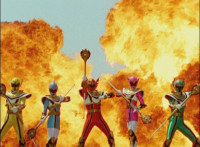 The five Rangers in Legend Mode twirl their Staffs, combining their colored seals into one big one, Red's visor gleams, then the team poses in front of an explosion. 50 Below & Fightoe react, as does Koragg. |
