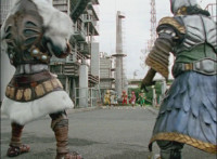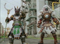 Red's Mystic Lion Staff's dial's 1 gleams. Green rushes ahead of the team, dials the 1 on his dial, whips up an energy ring, and uses it to fire a shower of boulders forth at Fightoe & 50 Below, spark bursting them. Pink does the same, firing a whirlwind of energy at the pair sparkily. Blue also does the same, crashing the pair with a tidal wave. Yellow follows suit, and fries the pair with lightning. Red finishes the sequence, shooting flames forth at the pair, sending them flying back. The Legend Mode Rangers rush up and face the downed Barbarian Beasts. |