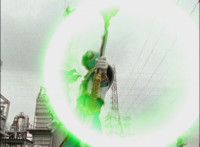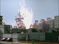 Recycled, per source; trimmed; cuts follow-up of hat tip; then cuts follow-ups of Fightoe talking, then throwing an energy bubble at Titan Megazord, who cuts it in half, then the pair fights for a bit. |