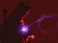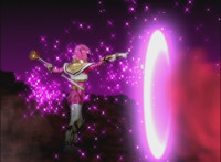 Pink leads the team in motioning Magi Staffs in the cockpit, as Titan Megazord charges up its saber and slashes a golden beam upward, cutting Fightoe's staff hoop in half. Fightoe looks at his broken staff, then crackles with purple electricity and shrinks. |