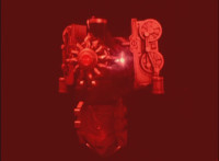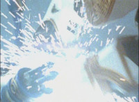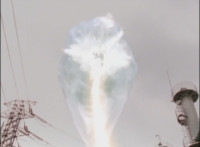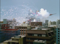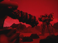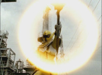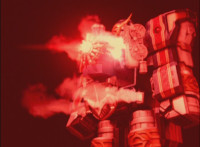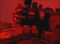 Trims start to remove Ursus' laser bolts; trims shot 2 as well; final shot has some flaring added to disguise the seal behind the Megazord? I guess? Beats me; cuts follow-ups of cockpit forming around the Rangers, who look around, then the Manticore poses as Ursus approaches. |