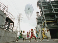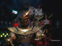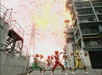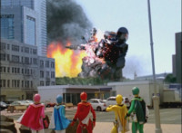 Fades in from black; cuts prior sequence of Rangers fighting and destroying Fightoe; cuts follow-up of Imperious talking and gesturing fan. |