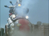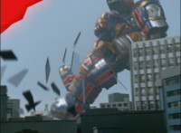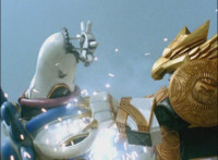 Ursus sparkily strikes Solar Streak Megazord into falling over, as the Rangers watch from the distance. |