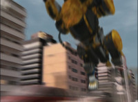 Breaking through the sky like glass, Solar Streak Megazord falls into the city from the red dimension. |