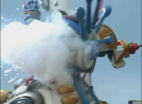 Fightoe whips up a few bubbles which transform into huge boulders that fly at Titan Megazord. |