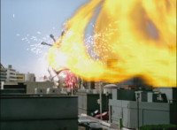 Manticore Megazord's flame wings wrap around the staff's blade tip, a golden light and seal appears before the five Rangers in the cockpit, as they slash their Staffs forth. Manticore Megazord whips their staff around and thrusts forth, sending the whirlind of flames at Ursus. The Rangers gesture their Staffs, then stand them up, and turn them sideways. Ursus explodes massively, as Manticore Megazord turns their back to it, triumphant. |