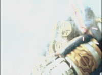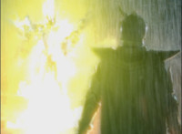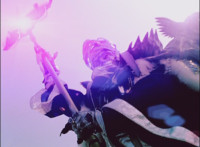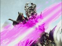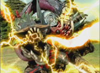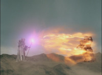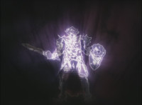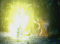Solaris Knight turns into a glowing ball of energy, streaking skyward, where Calindor, also in energy form, gives chase, the two energy balls clashing in the rainy sky, before they both crash back to Earth in a cave. |