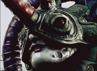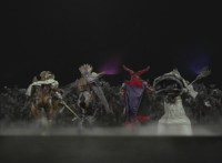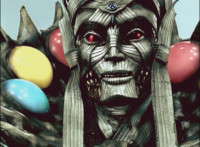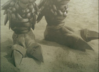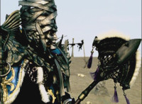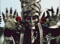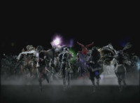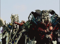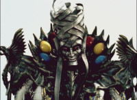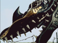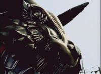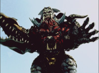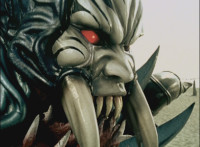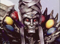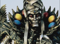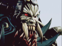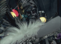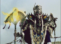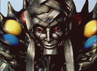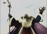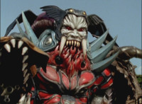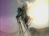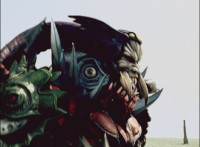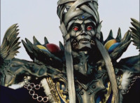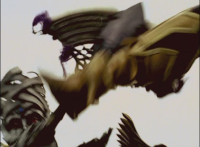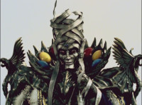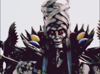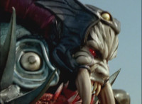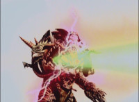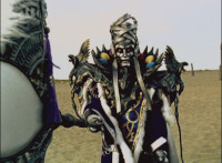 Close on Imperious talking as he points. Dark spirits rise up from the desert and converge upon a point in the sky above Imperious, lowering down as they crackle with power, and crash into the ground, the dust settling as Chimera is revealed, made up of heads of various previously destroyed monsters! Imperious approaches and talks behind Chimera. |