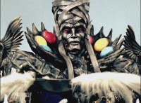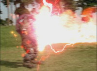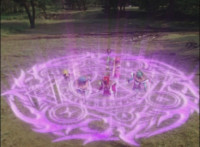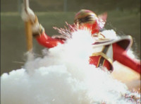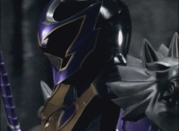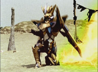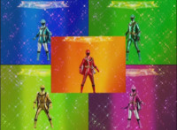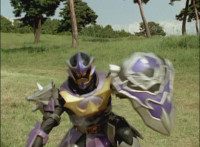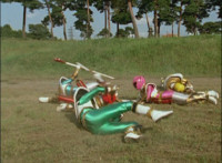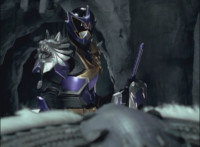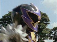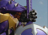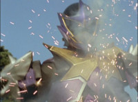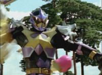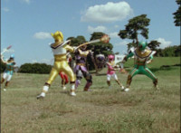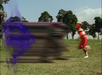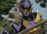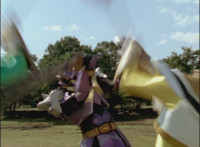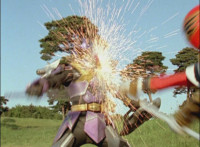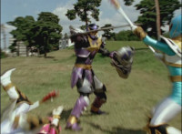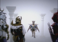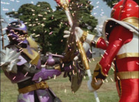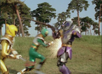Chimera is struck by the stream of flames, but blocks them, and returns the power with their own energy blast, smoke bursting the Rangers down. Yellow sits up and speaks, as does Blue. Zoom in on Chimera, firing another head hand blast, which crackles about the Rangers, bursting them again until they fall and roll. Red rolls back over and looks, as Koragg stands there, Chimera joining his side. Koragg resheathes his saber, then gestures forth, causing a purple seal to appear beneath the Rangers. They react as they're sucked down into the seal! |