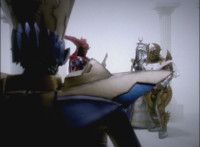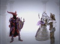 In a white void with columns, Ancient Mystic Warrior forms of Leanbow, Niella, and Daggeron meet. They talk. |