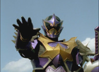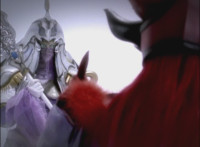 Imperious talks and gestures about. Solaris Knight recovers to his feet. Imperious talks some more, then points his fan staff at him, talks some more, then uses a purple seal to grow gigantically. Solaris Knight reacts, as does Jenji in the Laser Lamp, before Solaris Knight punches his ticket with the Solar Cell Morpher, then holds it forth. |