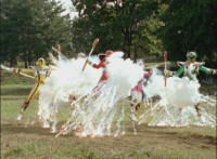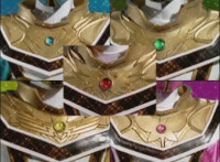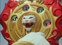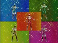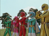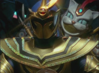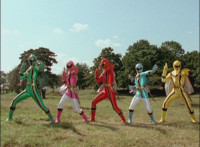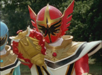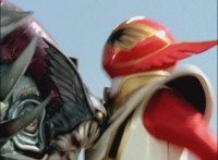 Koragg speaks, Green touches his chest, Yellow does too before clenching fist, Red responds and points, then leads the team in raising their Mystic Morphers high and transforming into Legend Mode. Koragg responds, unsheathes his saber, points it forth, the Rangers ready their Mystic Lion Staffs, then leap over the camera, landing all around Koragg. He slashes at them as they rush past him. |