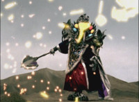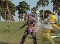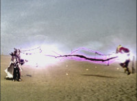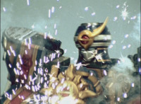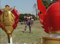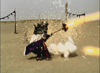 Solaris Knight fires his Laser Lamp at Imperious, who blocks it with his fan staff, so Solaris Knight leaps up, jumpkicks into him, but Imperious blocks it. Solaris Knight lands, blocks Imperious' strike, then flips over as he tries to fan slash again, but recovers. Imperious speaks, then fires dark energy at Solaris Knight, sending him flying back. Imperious speaks again, raises his fan which flashes, and spark bursts Solaris Knight, until a dirt burst erupts. |