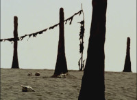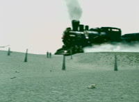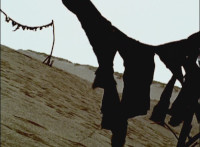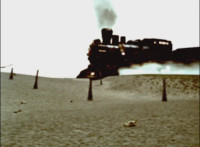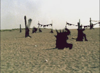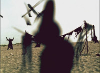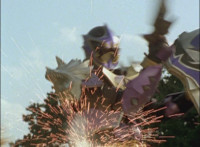 Transitions in; each shot fades into next; cuts close-up of a skull between shots 2 & 3; pair of counterparts erased from shot 3. |