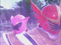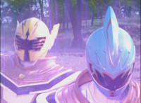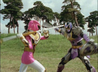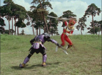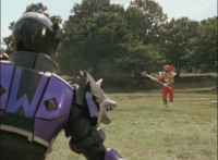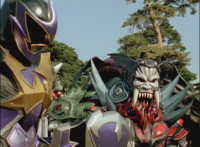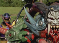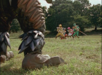 Koragg rolls to a crouch, as Red rushes at him. Koragg is ready, but then turns to see a purple portal open up, and Chimera races through it, smashing into Red, sending him flying back, the Rangers regrouping around him to face this new monster. Pink speaks, as does Koragg, as Chimera also talks. Red gets up and talks too, before holding his Mystic Lion Staff forth. |