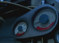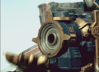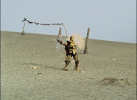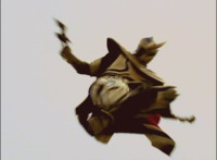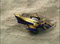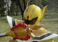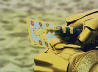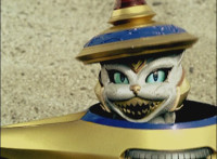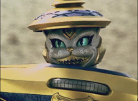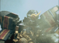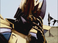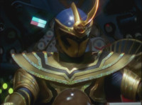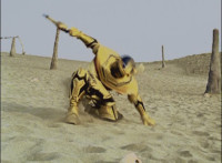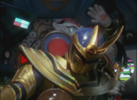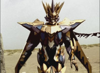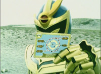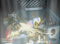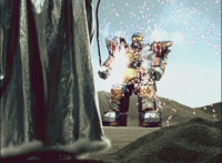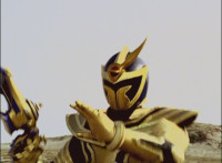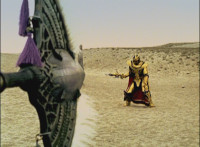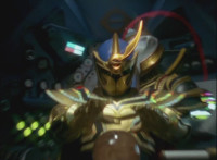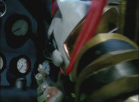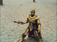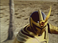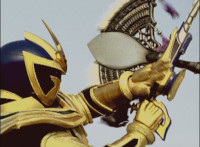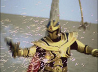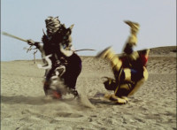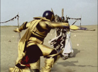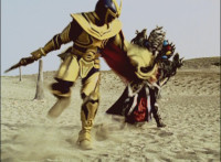 Imperious fan staff slashes the golden energy tracks to bits, then thrusts it forth, talking, before flashing the tip of the fan staff, spark bursting Solar Streak Megazord, then energy slashing it, shaking up the cab. Solaris Knight opens up the Megazord's chest hole, Jenji speaks to him, before he puts his hands over his crystal ball, firing a bolt of flaming energy from the chest of the Megazord at Imperious, who absorbs it with his fan staff. Solaris Knight & Jenji react, as Imperious speaks, then converts the energy blast into an absorption of Solar Streak Megazord's entire energy supply. Jenji reacting while reading the gauges. Solaris Knight replies to him, when all of a sudden the Megazord glows, the entire cab doing the same until the light blinds the both of the pilots, and when the light fades, Laser Lamp falls into the sand, with Jenji inside. |