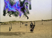 Calindor raises his head, his face all fangy, as he flings sand forth, shooting yellow electricity with it. |