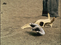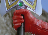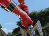 Lying on his back, Red spots his Magi Staff in Saber mode a few feet away, as Koragg stands nearby, pointin his saber at it, encouraging him to make a go for it. |