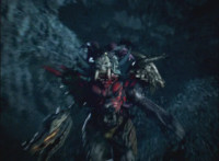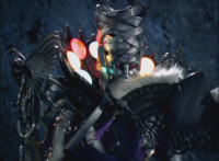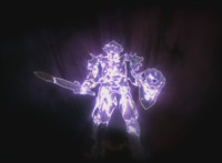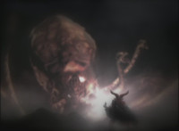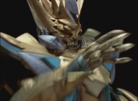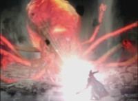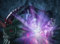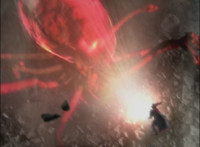 Falling back into the Underworld at a fast speed, Leanbow bashes a tentacle head away, then lands, pulls out his saber, and faces Octomus, the Master himself. Necrolai spots this, speaking but getting pummeled by falling rocks. Octomus' eye shimmers, flowing electricity at Leanbow's shield, as he holds back the power and speaks the whole while. Once it ends, Leanbow tosses his shield aside, then raises his saber high, its tip gleams. Leanbow speaks as he grips the saber with both hands, and slashes downward, causing a burst of light that begins to engulf Octomus. Tentacles scrap the walls, rocks crumble down upon Hidiacs and Styxoids, not to mention Necrolai, crushing them all. Octomus slowly begins to become overwhelmed by the white light, Leanbow included, as they sink into the ground and the light grows. |