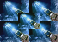 A hand holds a Mystic Morpher into the air, which creates a seal in the stormy sky above. |