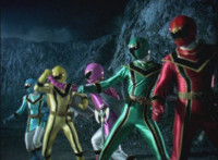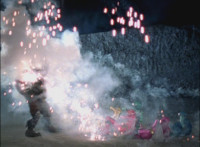 The five Rangers pose, then rush in to fight Chimera, only for each to take a turn getting sparkily struck away. |