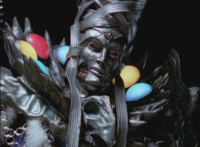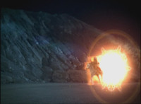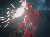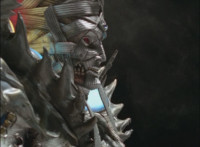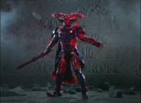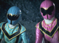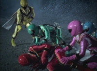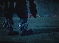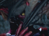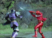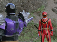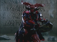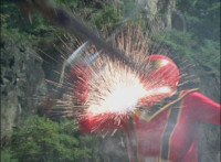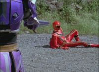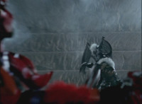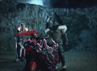 Necrolai goes over to Leanbow, reaches out and grabs his chin, holding his gaze up to her as she talks, then she gets in front of him, pulls him up to his feet and teleports away with him. The Rangers take a break from getting their butts kicked to react at this. Chimera leaps forth and fires a bolt, bursting the five down. Chimera lands and taunts, Red gets up, pulls out his Magi Staff, poses with it, ignites his arms at his sides, then flies forth in flaming bird mode. Chimera swats him away with ease. Red falls hard as his teammates regroup around him. Chimera speaks, then charges at the team, who react while helping Red get back on his feet. Chimera continues to race at them. |