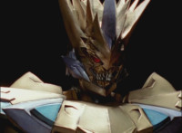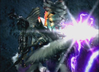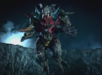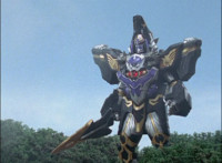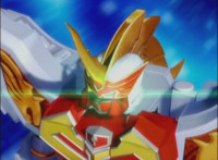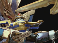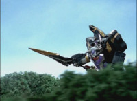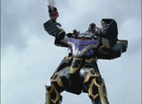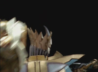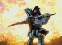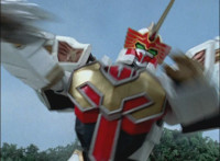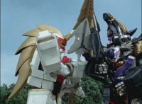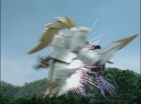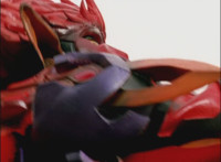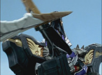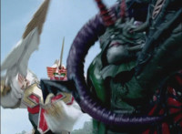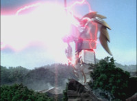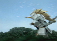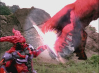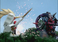 Phoenix Unizord talks, Centaurus Wolf Megazord responds by pointing their sword forth. Phoenix Unizord gets up angrily, then readies their sword, turns their back to Centaurus Wolf Megazord, facing instead Chimera and gesturing a fist at them. Chimera fires some electricity at Phoenix Unizord, who blocks it with their sword, then presses onward through the constant blasting, suddenly dashing forth and breaking through the beam. Chimera reacts. |