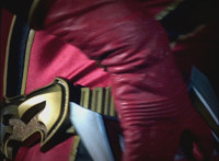 Red punches angrily in the air, then runs over, grabs his saber out of the ground, and turns to face Koragg, who remains pointing his saber at him, talking. They both talk at each other a bit, while Red remains standing there with saber in hand. |
