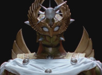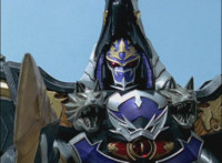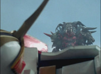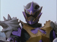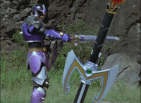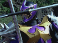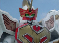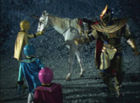 Solaris Knight fires his Laser Lamp, bursting Chimera away from the downed Rangers, causing them to fall near Imperious, who reacts. The Rangers also react, as Solaris Knight rides toward them. Imperious speaks, then holds up his fan. |