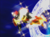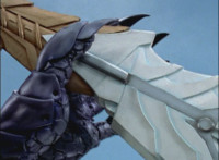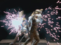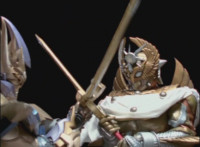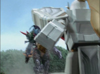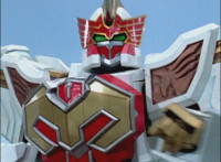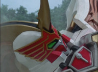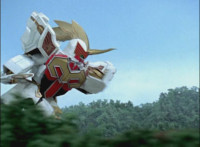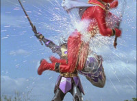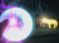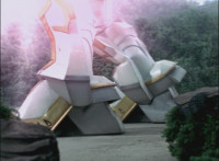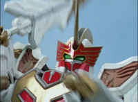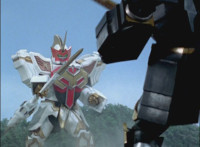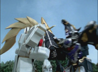 Phoenix Unizord slashes at Centaurus Wolf Megazord, who blocks it, then sparkily slashes in return. Centaurus Wolf Megazord twirls their sword around and goes to strike, but Phoenix Unizord blocks it, before breaking off. Phoenix Unizord and Centaurus Wolf Megazord race at each other, energy slashing each other sparkily as a result. A flash of light, and Red and Koragg fall to the ground. Both quickly recover, with the Ranger racing at the Wolf Knight, sparkily slashing at his shield a few times, evenly matched as they dodge and counterstrike repeatedly, no one getting the upperhand. |