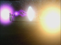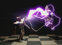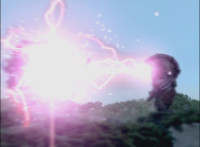 The Laser Lamp, with Jenji peeking out, materializes in Calindor's hand. Daggeron pauses his sword, getting blasted with dark electricity by Calindor as a result, soon lifting him up off his feet and bursting him in midair. |