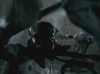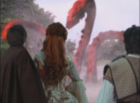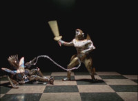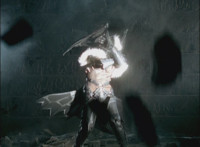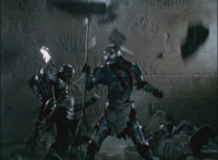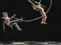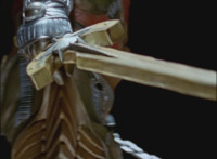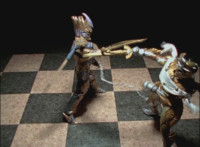 Calindor & Daggeron exchange kicks, clash sabers sparkily, then Daggeron wraps his chain around Calindor's sword, and then twists around and leaps up, disarming his enemy and knocking him off his feet. |