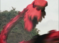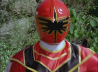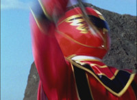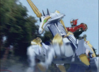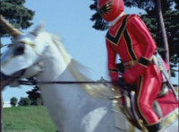 Red gazes off in contemplation, then looks up as he sees Chimera growing gigantically. Red ditches his teammates, running off, mounting Brightstar, then riding him away. After passing through a portal, Red turns into Mystic Phoenix riding atop the Zord form of Brightstar! |