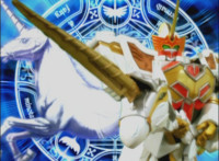 Phoenix Unizord charges up their sword tip with unicorn magic, diving downward and strike Chimera from straight overhead, causing them to explode massively, as Phoenix Unizord slides to safety. Centaurus Wolf Megazord awaits, so Phoenix Unizord rushes over and sparkily clashes blades with them. |