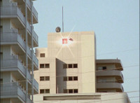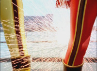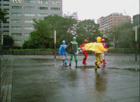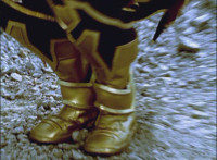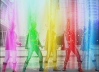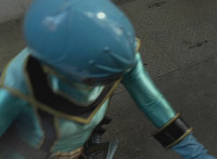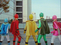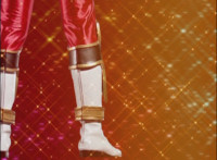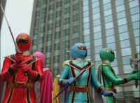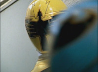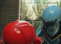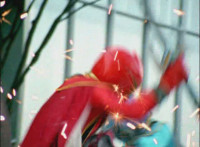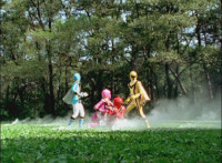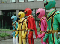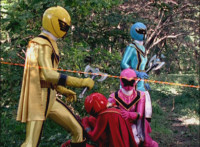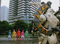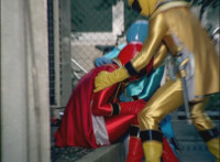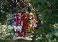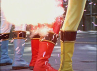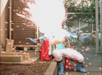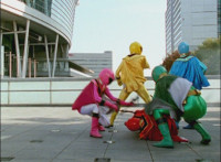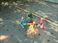 A gleam shines in a window behind the Rangers, and a spark burst erupts upon Red's right calf, toppling him to the ground. Pink & Green rush to his side while Blue & Yellow are vigilantly looking for where it came from. Suddenly, blasts come from every angle, one after another, each of the four Rangers blocking the bolts. Green then speaks, before he and Yellow help Red to his feet. |