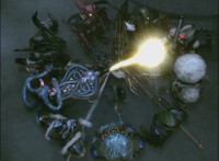 Downward angle on the 9 Terrors standing in a circle, weapons pointed at each other, a golden ball of light spins around and rests upon the weapon of Oculous. |