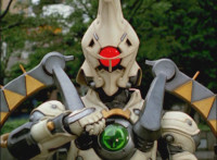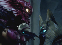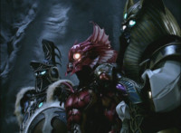Itassis walks in front of Daggeron, and aims her arm cannon at Megahorn, who reacts. The two Terrors face one another across the battlefield, with Daggeron witness. Itassis talks, Megahorn listens. |