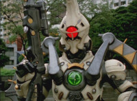 Megahorn charges up his sword with a green energy ball, then flings it forth. |