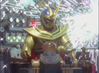 Solaris Knight leaps up and over Megahorn, landing a safe distance away, where he whips out his Laser Lamp, slaps it a few times, then fires it at Megahorn, who stands there as his body spark bursts and smokes. Unharmed, he rushes forth. |