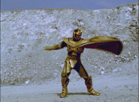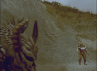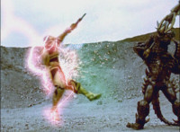 Megahorn sparkily slashes Solar Streak Megazord, followed by another energy slash that sparks and shakes up Solaris Knight and Jenji in the cockpit. Megahorn lights his eyes up, then spews an energy breath of green power right at Solar Streak Megazord, exploding it so hard that Solaris Knight is forced to abandon cockpit, falling to the quarry below, with Megahorn shrinking down to join him. Solaris Knight recovers in a defensive pose, as Megahorn talks for a moment, before the two of them rush at one another. Necrolai lands on a cliff above them. |