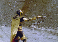 Yellow spots a red gleam from a distant window, slashing the bolt of energy before it can hit him. The team all gawk at where the shot came from, Red speaking, then more gleams from the window. The Rangers raise their Magi Staffs and glow brightly with their power colors, deflecting the blasts. |