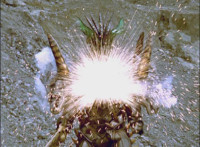 Shot 1 is split off from end of prior shot; cuts final shot before Megahorn is engulfed in an explosion, US replaces it in fact with family-friendly background explosions. |