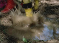 Yellow stepping in a mudhole briefly, the four remaining Rangers continue to help Red walk as they flee through the woods. |