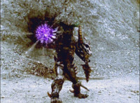 Megahorn energy slashes Solaris Knight, sending him flying across the battlefield. Megahorn then summons up a purple ball of energy, shooting it forth at Solaris Knight, who just got back on his feet, and is suddenly overwhelmed by the orb. |